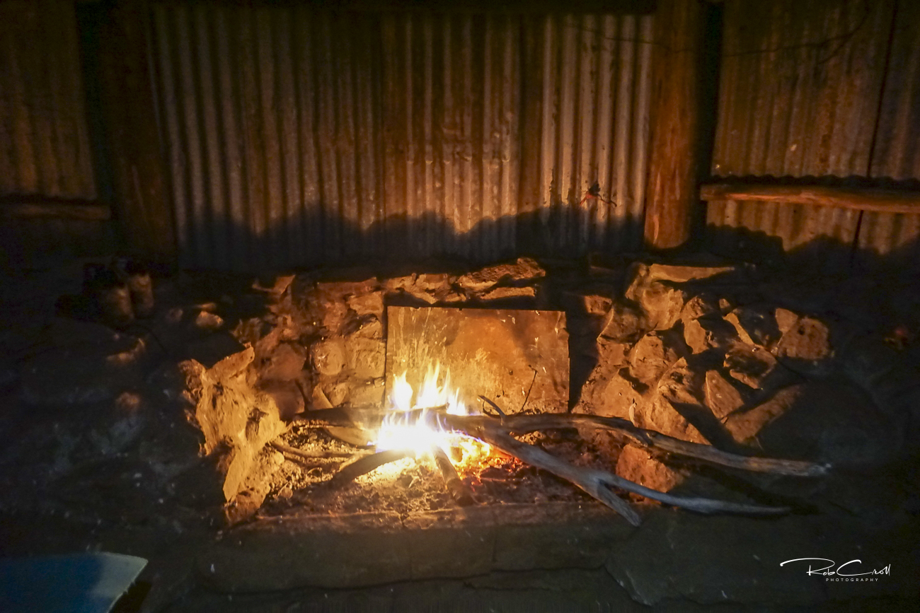 Bill Jones Hut is a single-room slab structure built with bush-hewn timber and corrugated iron roofing. It features a stone fireplace, split timber walls, an iron chimney, and an earth floor. The hut reflects the utilitarian needs of grazing life.