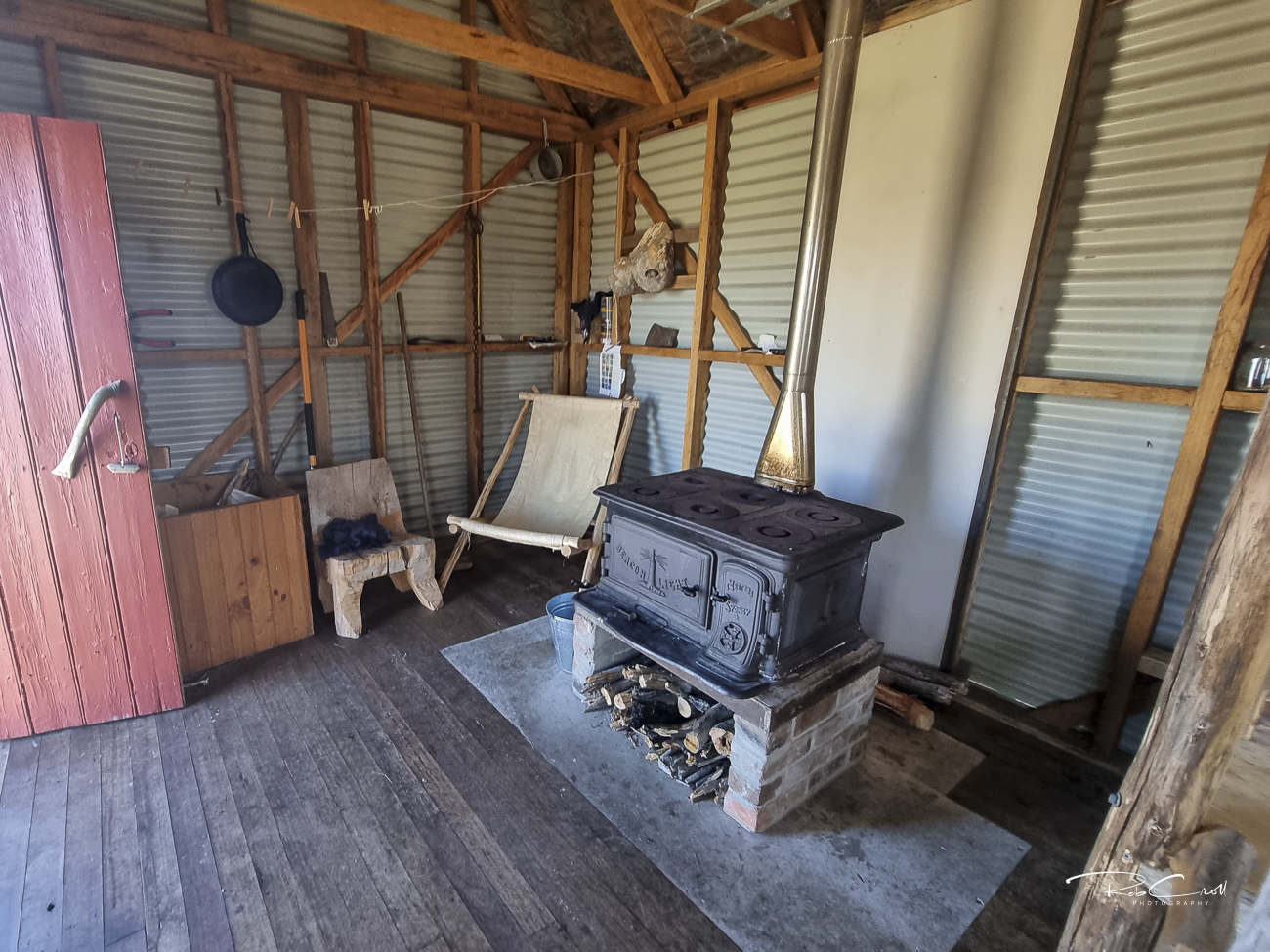 Boobee Hut measures approximately 6.5m × 2.8m, with external walls and roof clad in corrugated iron. It features a wooden floor, stone hearth, and iron chimney supported by external timber poles. Internally, a raised sleeping platform provides basic shelter. The hut is compact, weatherproof, and well-maintained.