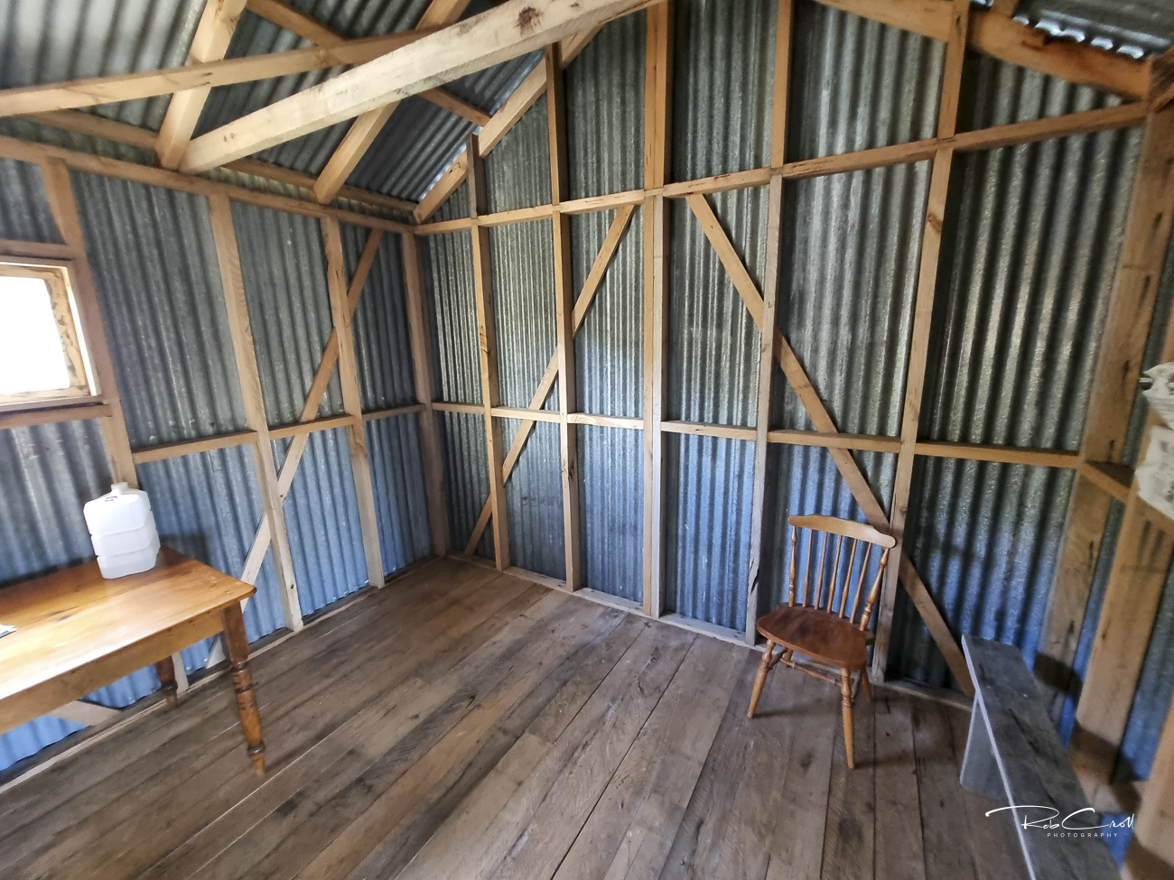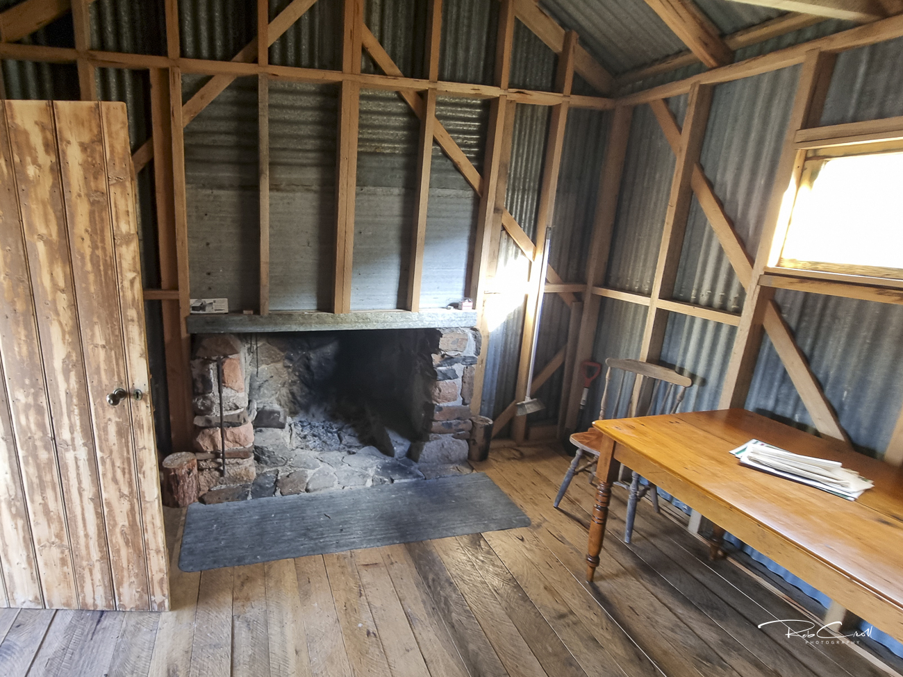 The hut measures approximately 8m × 4.5m including the verandah. It features a timber frame, corrugated iron cladding, and a sawn timber floor. The fireplace is substantial, with mud-mortared stonework and a concrete hearth. A single window faces east, and the roof pitch was retained from the original design.