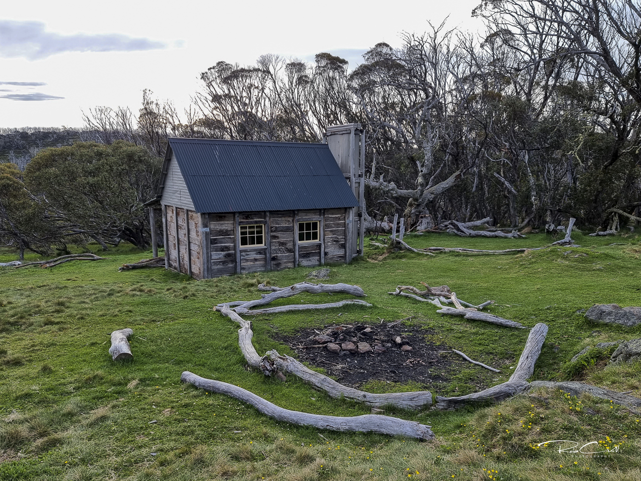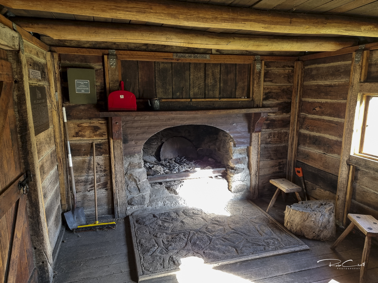 The original hut’s stone fireplace lies in ruins nearby and is protected as a heritage feature.