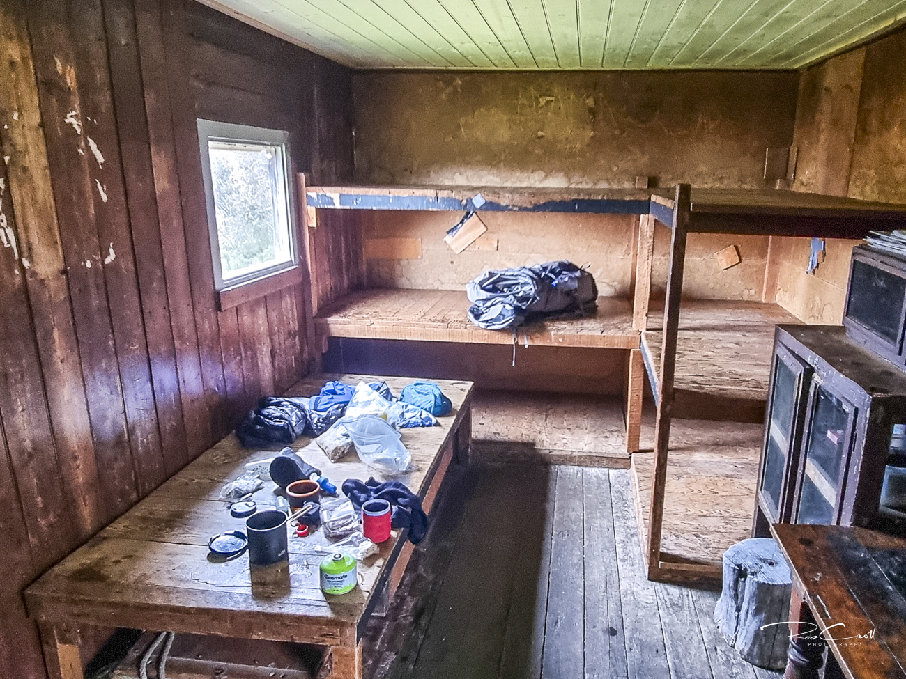 Grey Mare Hut is a single-room structure with corrugated iron walls and roof, a timber floor, and a stone fireplace. It includes five bunks and ample space for gear storage. The hut’s design is utilitarian, reflecting its mining origins and alpine function.