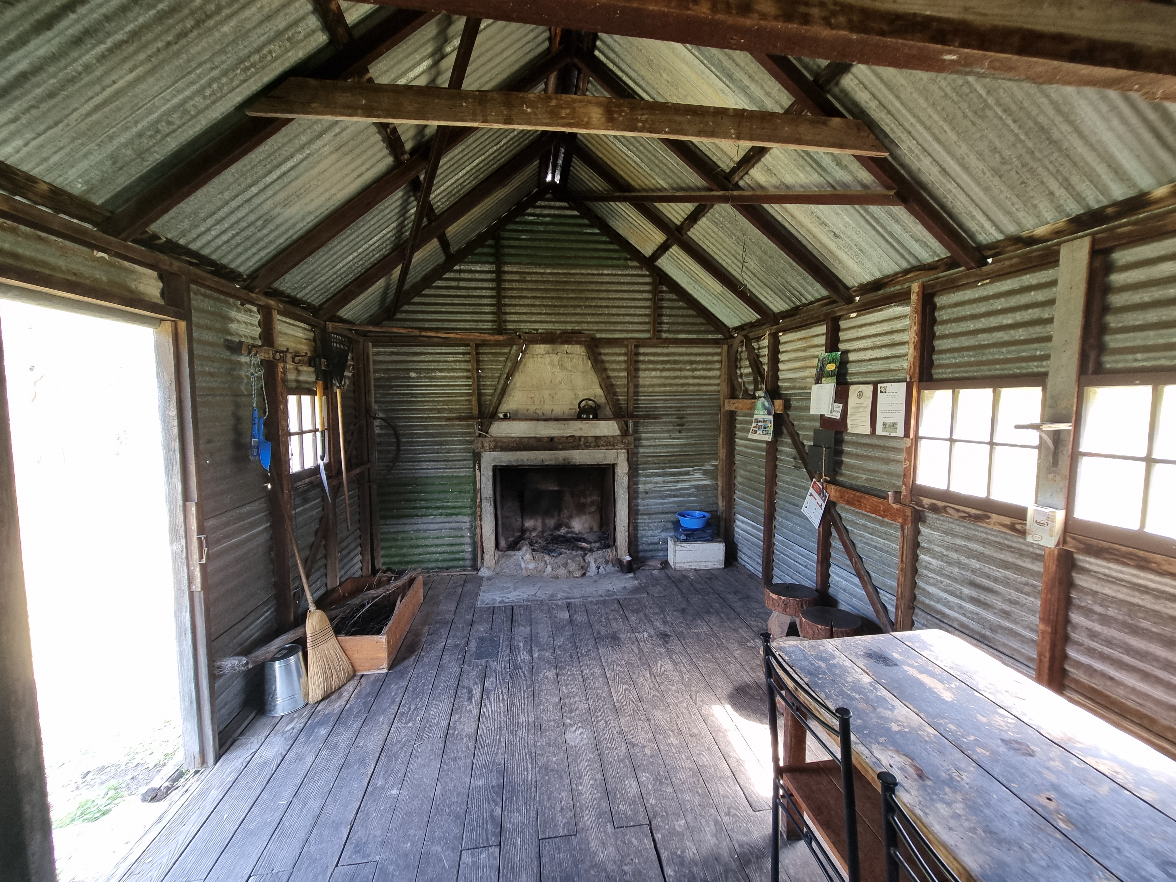 The hut is built of corrugated iron over a timber frame, with a concrete fireplace and iron flue. It has a single room and no internal lining. The floor is earthen, and the structure is weatherproof but basic.