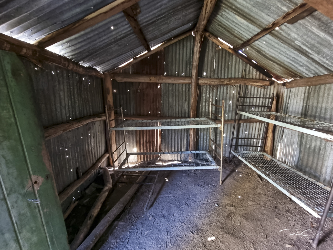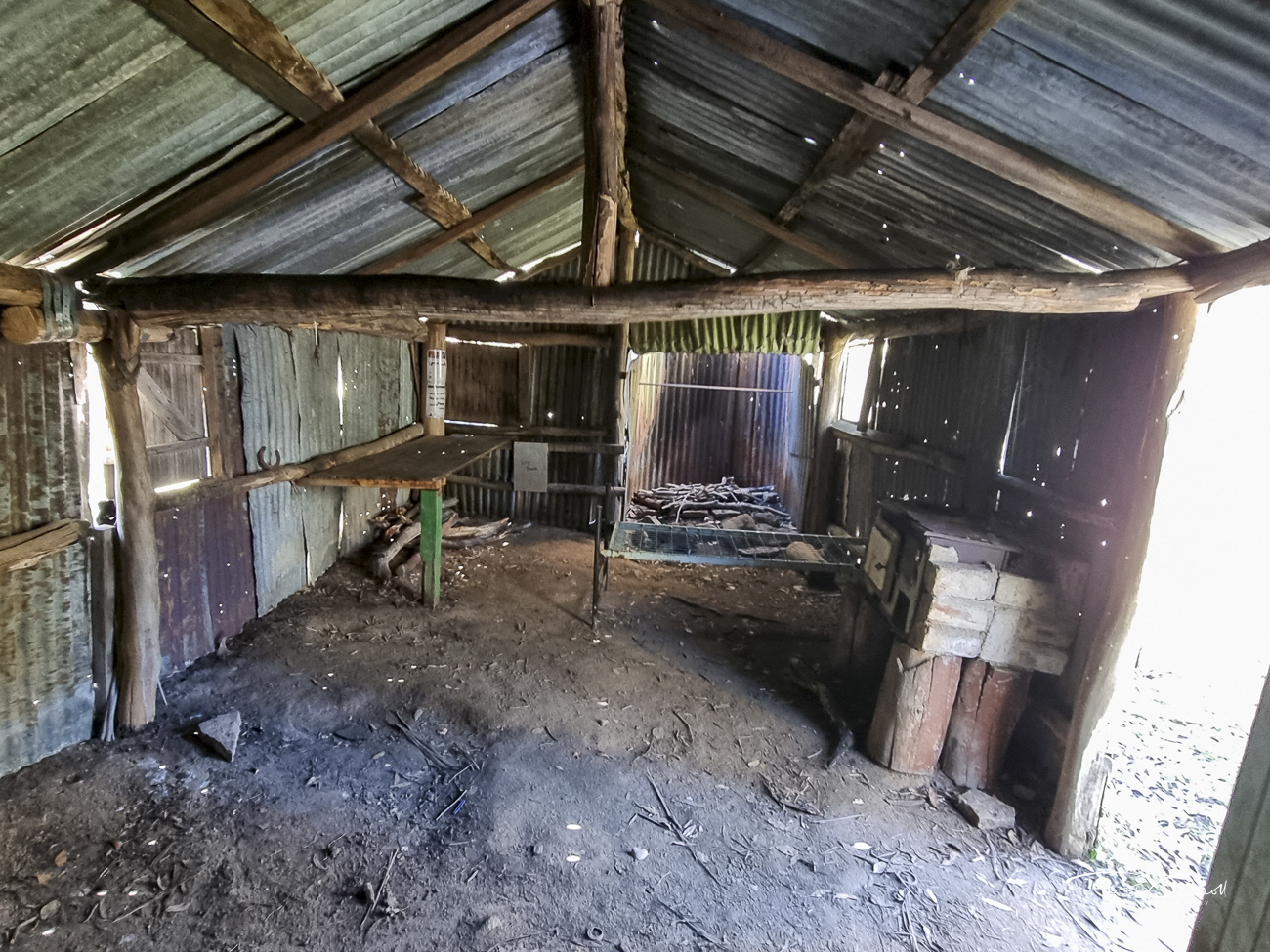 The hut is modest but practical, measuring 9 metres by 4.5 metres, and built from bush timber poles with corrugated iron walls and roof. Inside, it features two beds, a sink, and a wood-burning “Bega” stove. The fireplace has a rock and cement hearth, while the rest of the floor is dirt. There are two windows—one glazed, the other fitted with a drop-down shutter.