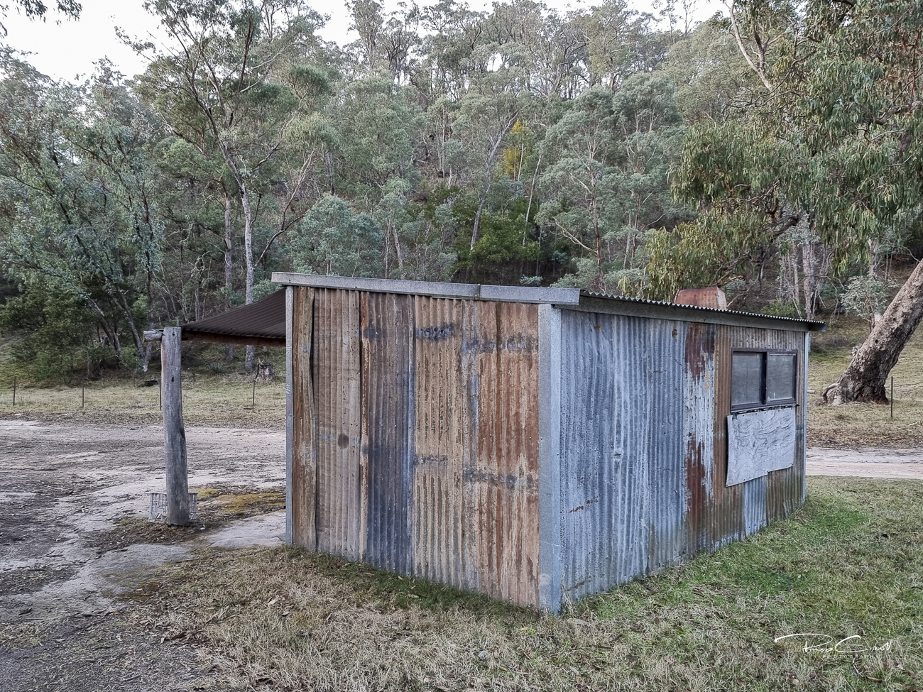 McIntyres Hut is built of poles and corrugated iron, with a wooden floor, gable roof, and two windows. It includes a verandah overlooking the Goodradigbee River. The structure is weatherproof and functional, though rustic.