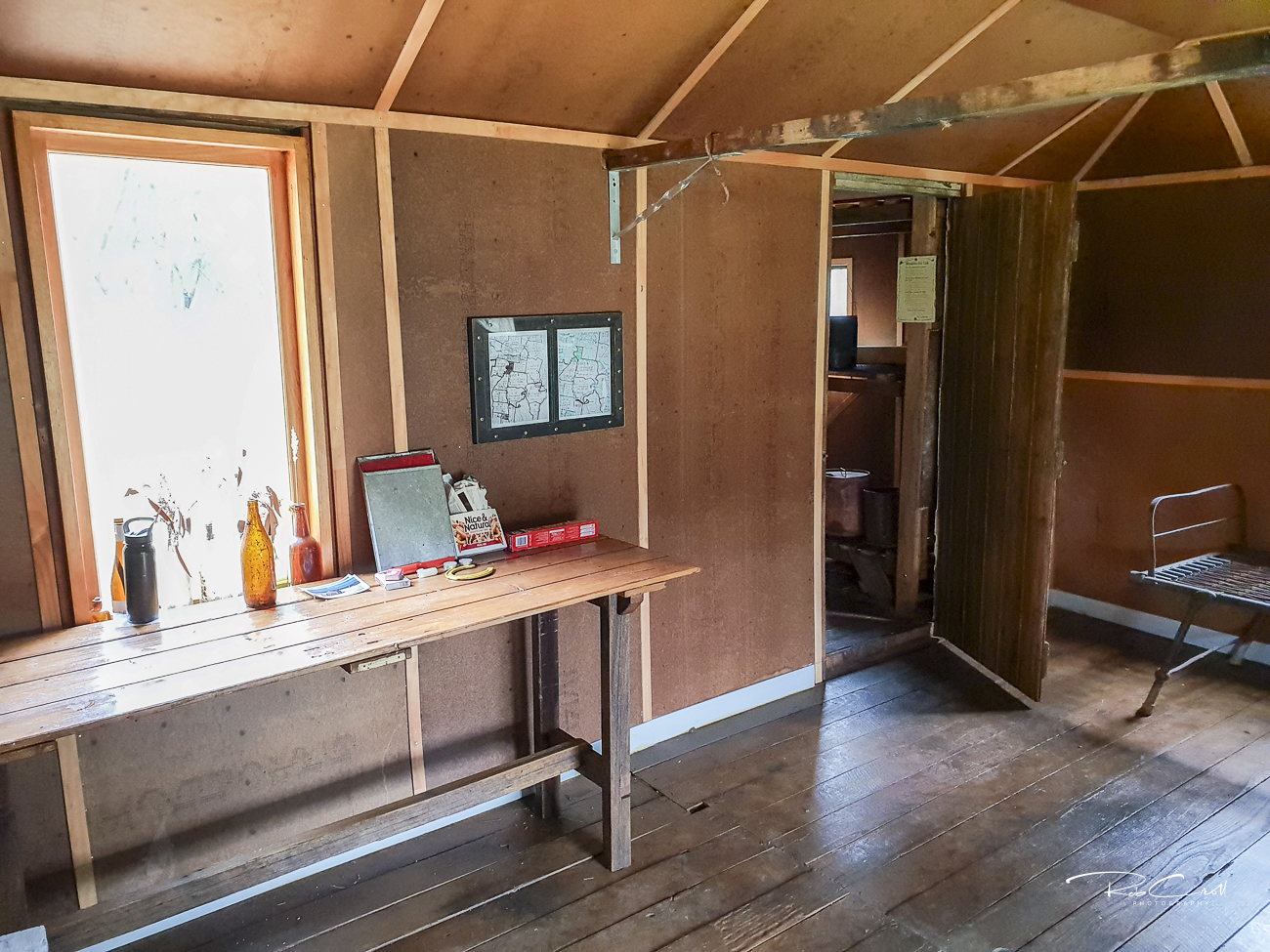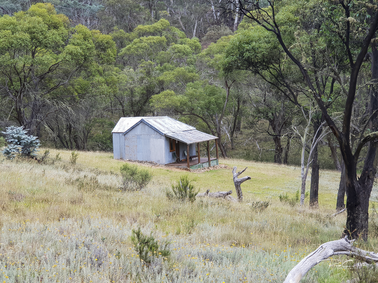 The hut is dry and weatherproof, with basic furnishings and a gambrel still hanging on the wall — once used for dressing sheep.