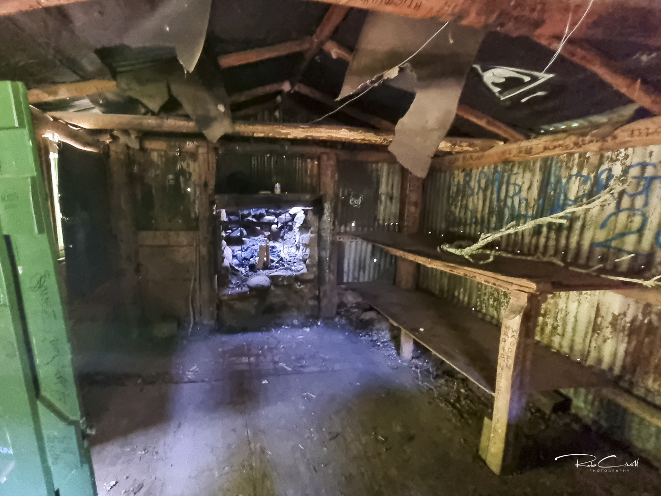 The current hut is a timber-framed structure clad in corrugated iron, with a pitched roof, wooden floor, and stone fireplace. It includes basic furnishings and a small porch. The hut is dry and weatherproof, though rustic and remote.